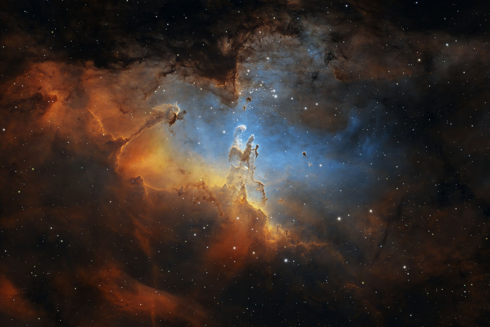 The Eagle Nebula, Messier 16, is a stellar nursery 7000 light years away in Serpens, immortalized by the Hubble Space Telescopes iconic Pillars of Creation image. This center crop reveals towering columns of cold molecular hydrogen and dust, some stretching 4 to 5 light years tall, where new stars are being sculpted from the cosmos. Intense ultraviolet radiation from hot young stars in the cluster NGC 6611 simultaneously illuminates and erodes these pillars through a process called photoevaporation. Within the densest knots of these columns, known as evaporating gaseous globules EGGs, protostars are forming, shielded from the destructive radiation. This image captures the dramatic interplay between stellar birth and destruction.