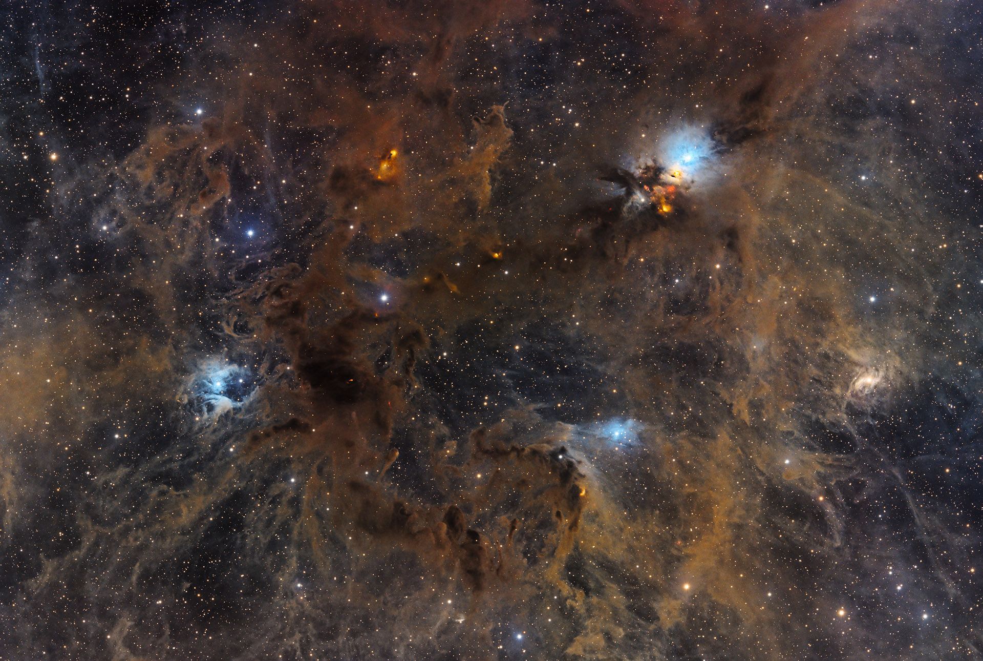 The Perseus Molecular Cloud is a vast stellar nursery roughly 1000 light years away, where hundreds of new stars are being born within dark dense clouds of gas and dust. This complex contains several remarkable regions, including NGC 1333, a compact reflection nebula illuminated by embedded protostars, and IC 348, a young star cluster barely 2 million years old. The intricate interplay of dark nebulae, reflection nebulae and emission regions creates a tapestry of cosmic creation. Studies of this cloud have revealed over 400 young stellar objects, many still surrounded by protoplanetary disks where future planetary systems may form, offering us a glimpse into how our own solar system looked 4.6 billion years ago.
